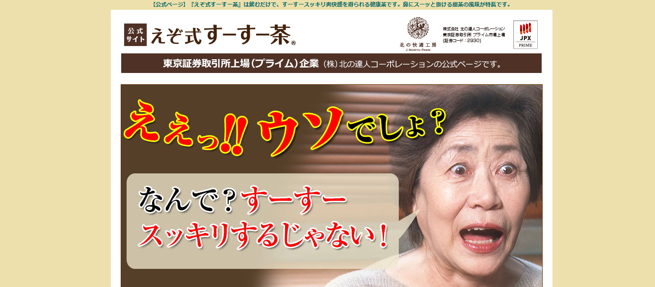 株式会社北の達人コーポレーションが開発した【えぞ式 すーすー茶】は、そんな「グズグズ」「ズルズル」といった不快な状態にお悩みの方の、爽快な毎日をサポートするために生まれた健康茶です。古くから健康維持に役立てられてきた自然の茶葉を、独自の黄金比でブレンド。ノンカフェインで天然の甘みがあるため、どなたでも安心して、美味しく飲み続けられるのが特徴です。えぞ式 すーすー茶を新しい習慣として取り入れ、毎日を「すーすー」と快適に、前向きに過ごしませんか。